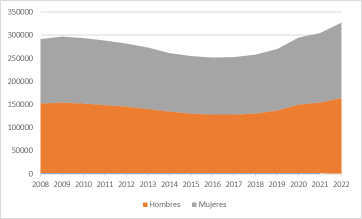 A falta de datos definitivos y una explotación exhaustiva del Padrón de Habitantes, a día de hoy puede decirse que continúa existiendo un equilibrio entre la cantidad de hombres y mujeres nacidos en Argentina empadronados en España (164.404 frente a 163.029 respectivamente). Si bien en los últimos seis años se han registrado incrementos de magnitudes similares en ambos grupos, las mujeres aumentaron ligeramente más: en 2022 hay 37.773 hombres y 39.797 mujeres más que en 2016. De confirmarse esta tendencia, significaría un cambio respecto a flujos migratorios anteriores donde emigraron más hombres.