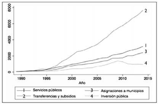 Elconjunto dereglasque establecenqué actoresycómo intervienenen la determinación de la composición del gasto puede haber influido en el hecho de que el grueso de los recursos estatales no sea empleado en gasto deinversión,sinoqueesdestinadoaotrosrubros7.Enparticular,aproximadamenteel70porcientodelosrecursostotalesdelosestadossonutilizados en gasto corriente (México Evalúa, 2013)8. Estos gastos incluyen los costos operativos del gobierno (servicios personales, materialesy suministros, gastos y adquisiciones) y buena parte de este gasto no necesariamente contribuyeamejorarlacalidaddevidadelapoblación(Scott,2011).EnelGráfico 1 es posible observar la evolución de los componentes más importantes del gastoestatal.Loprimeroquesepuedenotaresqueelmontototaldelgasto público estatal por habitante ha crecido sostenidamente desde el año 1990. Además,seobservaqueelrubroquemásaumentófueeldelastransferencias y subsidios, en contraposición al gasto por habitante en inversión pública.