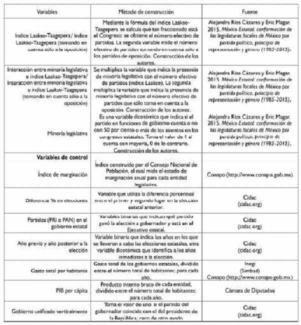 Con el fin de corroborar la validez de las hipótesis planteadas, empleamosdosmodeloseconométricosmultivariados.Mientrasqueenelprimero de ellos se emplea como variable dependiente el gasto por habitante de los gobiernosestatales,enelsegundoseusaelcambioenelgastoporhabitante delosgobiernosestatales.Elcambioenelgastoporhabitantedelosgobiernosestatalesseobtienecalculandoladiferenciaentreelgasto porhabitante estatal del año en curso y el del año anterior. La importancia del segundo modelo radica en que permite evaluar directamente elimpacto de nuestras variablesdeinterés-elgradodefragmentaciónlegislativaylapresenciade una mayoría en el congreso estatal del partido del gobernador- sobre los cambios marginales en la magnitud del gasto público estatal por habitante. Losdatosparalaconstrucción delasvariablesdependientesyvariasde las variables explicativas fueron obtenidos del Sistema Estatal y Municipal de Bases de Datos de México (Simbad), el cual es un banco de datos construidoporelInstitutoNacionaldeEstadísticayGeografíadeMéxico(Inegi). Utilizamos estos datos para construir un panel balanceado con los datos anuales que miden indicadores económicos y políticos de los 31 gobiernos estatales durante el periodo entre 1989 y 201411.