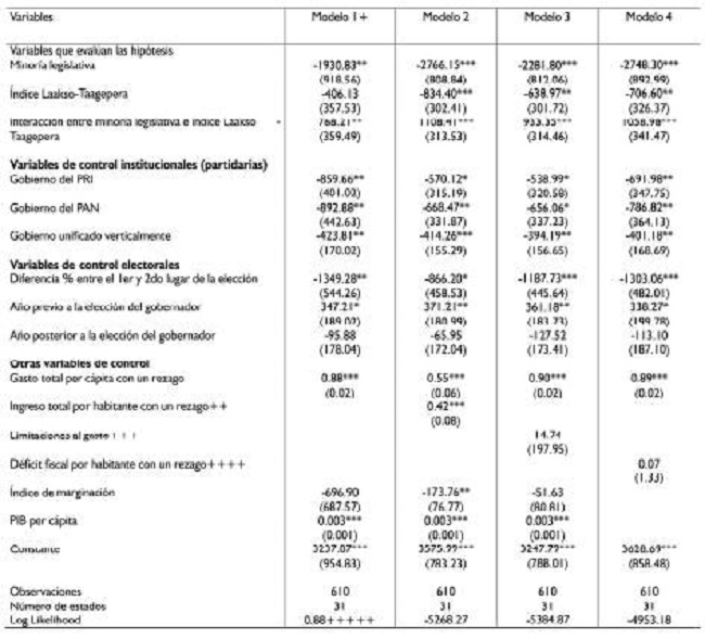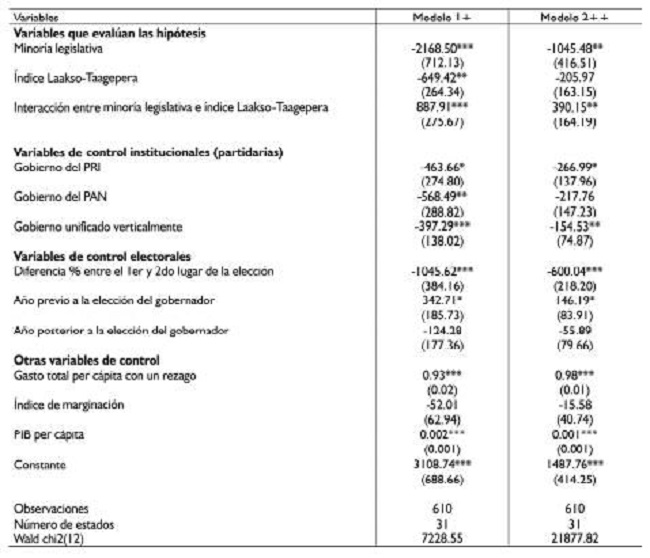 + emplea efectos fijos (aunque la variable Índice Laakso-Taagepera no es estadísticamente significativa, pruebas de hipótesis parciales muestran que su inclusión junto con las variables Minoría y la Interacción entre minoría legislativa e índice Laakso-Taagepera se hace necesaria para explicar variaciones en el gasto por habitante).