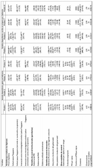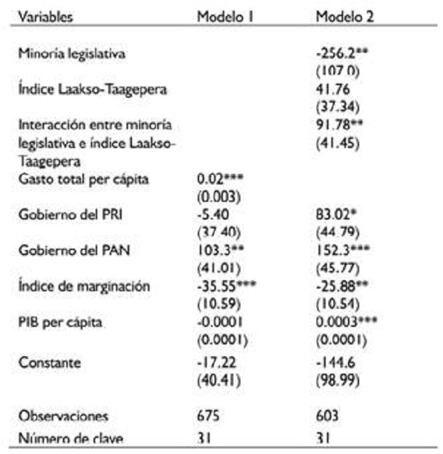 ++ Corrige los errores estándar ante la posible presencia de heterocedasticidad (aunque la variable Índice Laakso-Taagepera no es estadísticamente significativa, pruebas de hipótesis parciales muestran que su inclusión junto con las variables minoría y la interacción entre minoría legislativa e índice Laakso-Taagepera se hace necesaria para explicar variaciones en el gasto por habitante).