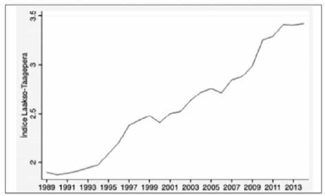 A partir de 1989, la pluralidad política en los estados ha logrado avanzar, pese a que aún no ha concluido este proceso democratizador. En particular, los estados de Tamaulipas, Estado de México, Hidalgo, Durango, Colima, Coahuilay Campeche aún no han sidogobernados por un partido distintoalPRI.Lospartidospolíticosdeoposición-entrelosquedestacan el PAN y el Partido de la Revolución Democrática (PRD)- aún no logran competir exitosamente con la maquinaria del PRI en este grupo de estados10. A pesar de estos retrasos, se puede apreciar que la pluralidad y la fragmentación legislativa subnacional se han fortalecido. Como consecuencia,elnúmeroefectivodelospartidosenlaslegislaturasestataleshacrecido consistentemente durante las últimas tres décadas. El Gráfico 3 muestra la evolución del número efectivo(promedio)de partidospolíticos en laslegislaturas estatales durante el periodo 1989-2014.