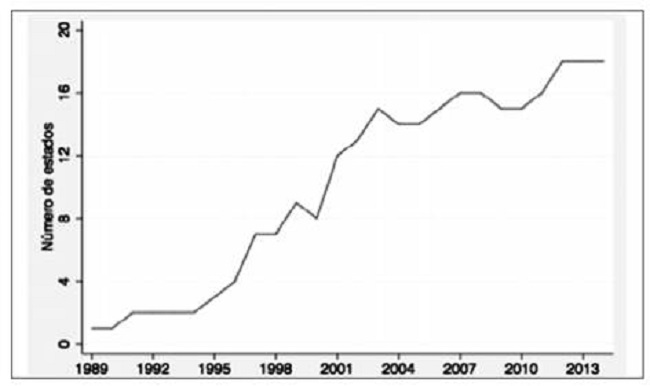Esta mayor fragmentación legislativa ha disminuido progresivamente laprobabilidaddequeunsolopartidocontrolelalegislaturaestatalatravés deunamayoríadeasientos.ElGráfico4muestraelnúmerodeestadospara cada año del periodo bajo estudio (1989-2014) en los que el partido del gobernador carecióde mayoríaen lalegislaturaestatal.