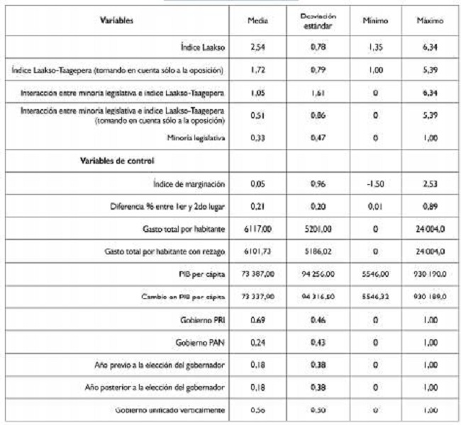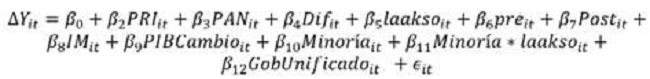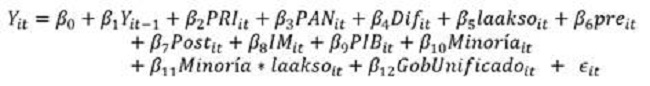dondeYit eselgastototalporhabitante,DYit eselcambiodelgastototalpor habitante, Yit-1 es el gasto total por habitante en el periodo anterior, PRIit o PANit son variablesbinarias que indicansi partido del gobernadoreselPRI oelPANrespectivamente,Difit esladiferenciaporcentualentreelganadory el segundo lugar de la elección anterior, laaksoit es uno de los dos índices Laakso-Taageperautilizadospara medir el número efectivo departidos (tomando en cuenta a todos los partidos con representación en las legislaturas estatalesosóloalospartidosdeoposición),preit yPostit indicansilaobservación del gasto corresponde alaño pre ypost electoral respectivamente,IMit eselíndicedemarginacióndelEstadoparaunañodeterminado,PIBit esel PIB per cápita anual, Minit es la variable dicotómica que indica si existe gobierno dividido, Min laaksoit representa la interacción (multiplicación) entre la variable binaria que muestra si existe gobierno dividido y el índice Laakso-Taagepera,yfinalmentelavariableGobUnificadoit indicalapresencia de un gobierno verticalmente unificado.