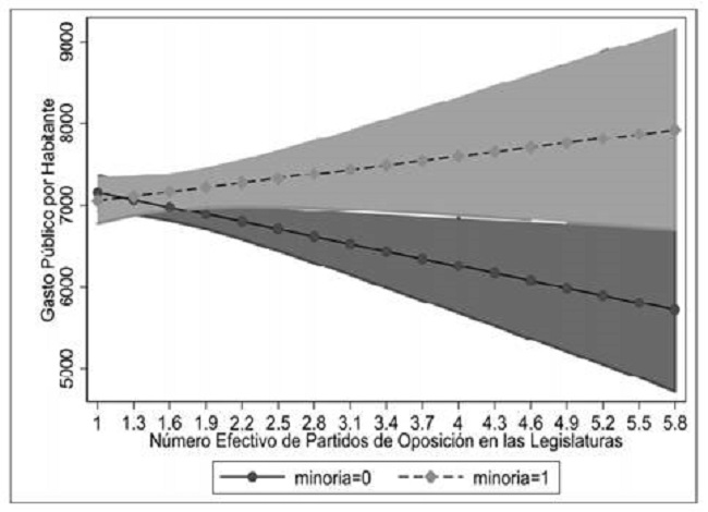 En las ocho especificaciones, verificamos que tanto el número efectivo de partidos en las legislaturas estatales como la condición minoritaria en la legislatura del partido del gobernador afectan el monto del gasto público. El coeficiente positivo de la interacción entre ambas variables sugiere que existe evidenciaestadísticamente significativaque apoyalasegunda hipótesis: incrementos en la fragmentación legislativa aumenta el gasto público por habitante cuando existe la condición minoritaria en la legislatura del partidodelgobernador.Paracalcularelefectodeambasvariablesporseparado (el número efectivo de partidos y la variable binaria que indica la presencia de gobierno dividido) pero que incluya el efecto marginal de la interacción entre ellas, procedemos a calcular el valor esperado del gasto público per cápita para distintos valores de ambas variables: la fragmentación legislativa y la condición de gobierno dividido.
