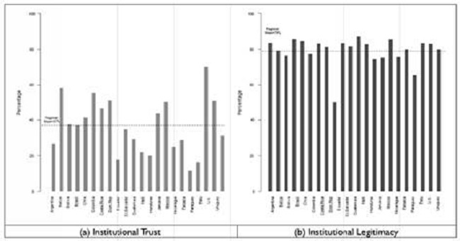 In this paper, we have evaluated institutional support for high courts across Latin America. Contrary to conventional wisdom, we suggest that these courts are not lacking in diffuse support; they are widely perceived as legitimateinstitutions.OurdatasuggestthatLatinAmericansupremecourts are just as legitimate as the U.S. Supreme Court, which has been widely regarded as the most legitimate constitutional court in the world.