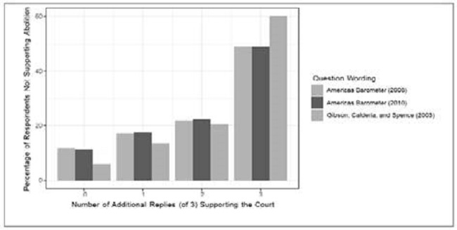 Figure 2 provides some data on this point from our MTurk survey. The data for the figure is restricted to those “court-protective” respondents on the abolition question (in other words, they would not abolish the court), andthecolorsofthebarscorrespondtothethreedifferentquestionwordings for that concept. The height of the bars indicates the percentage of those respondents who gave court-protective responses on the remaining three court curbing questions (regarding limiting independence, jurisdiction, or removing controversial judges). If it were the case that the “do away with” item was artificially inflating diffuse support, we should observe relatively high bars on the left-hand side of the figure: respondents are willing to support the Court against abolition but not against other types of attacks.