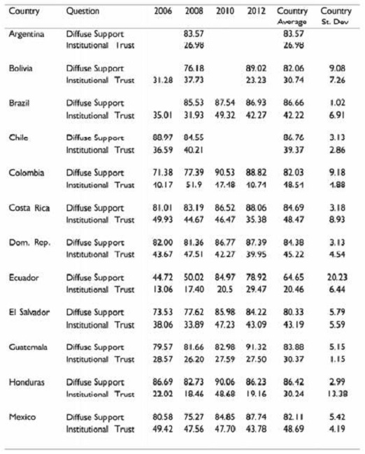 Table A1 takes a longer view of our measures of institutional support, reportingthenationallevelsofDiffuseSupportandInstitutionalTrustbetween 2006 and 2012. As noted in the paper, the Americas Barometer changed their wording of the diffuse support question throughout this time period. In earlier (2006, 2008) surveys, respondents were posed the following question:“Do you believe that there might be a time in which the president wouldhavesufficientreasontodissolvetheSupremeCourt,ordoyouthink that sufficient reason could never exist?” In later surveys (2010, 2012), the question,whichcontainsmorecontext,wasasked:“Doyoubelievethatwhen thecountryisfacingdifficulttimesitisjustifiableforthepresidenttodissolve the Supreme Court and govern without it?” Diffuse Support was coded as “1” if respondents answered either “No, there’s no sufficient reason [to dissolve the SC]” (2006, 2008), or when they responded “No, it is not justified” to the later surveys (2010, 2012). Where no country averages are reported, the question was not asked in that country-year.