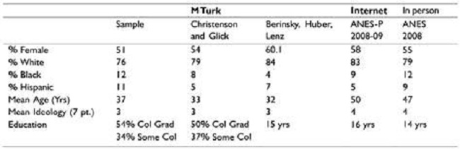 To this end, Table B1 compares the characteristics of our sample to those used by Christenson and Glick (2015), perhaps the most well-known investigation of public support toward U.S. courts to rely on MTurk data, the Berinsky, Huber, and Lenz MTurk sample, the 2008-2009 American National Election Panel Study (a web-based panel survey), and the 2008 American National Election Study, a well-known face-to-face survey.