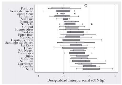 En los federalismos latinoamericanos, en general, y la Argentina, en particular, la desigualdad de ingresos está desigualmente distribuida. En efecto, la variación de los niveles de desigualdad considerada dentro de las diferentes unidades subnacionales es enorme. En el caso argentino, Tierra del Fuego es muy igualitaria para los estándares latinoamericanos, ya que tiene un índice de Gini provincial de 0,32 (en 2011), similar a Canadá y Australia (en 2011 y 2012, respectivamente. WIID, 2017). Pero Salta y Corrientes, por el contrario, son las provincias más desiguales de Argentina, con índices de Gini de 0,45 y 0,46 (en 2011) respectivamente, similares a Guatemala, Malawi y Paraguay (2014, 2010 y 2013 respectivamente; SEDLAC, 2016, WIID, 2017)1.