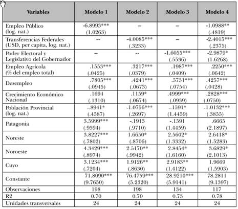 En una última estrategia empírica para analizar la robustez de los resultados, evaluamos el impacto de variables políticas (porcentaje de votos y bancas del gobernador) y fiscales clave (empleo público y transferencias nacionales) en tres modelos de regresión diferentes (1-3) y en un modelo final (4) en dónde incluimos todas las variables. Como medida resumen de las variables políticas, utilizamos un índice del poder electoral y legislativo del gobernador, que es una medida compuesta de su poder electoral y legislativo18. Seleccionamos las variables mencionadas arriba como representativas del grupo de variables políticas y fiscales porque son las más relevantes teóricamente y porque empíricamente son algunas de las más robustas en las correlaciones. Además, presentan una alta correlación con las otras variables dentro de cada grupo (por lo que se las puede considerar «representativas» del tipo de argumento). Utilizamos una serie de variables socioeconómicas de control, similares a las utilizadas en la literatura existente sobre el tema: crecimiento económico nacional, (el logaritmo natural de) población provincial total y el porcentaje de desempleo provincial.