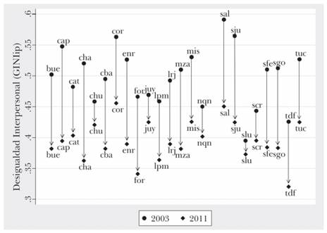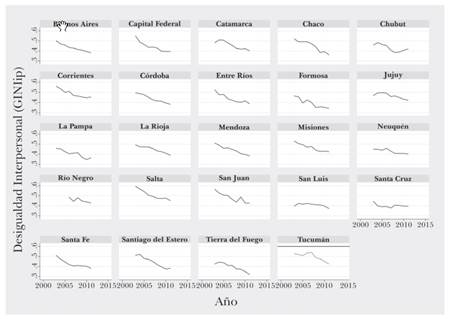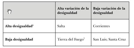 Además, el «ritmo» de variación de la desigualdad es también muy distinto entre las diferentes provincias argentinas. Si analizamos la variación del índice de Gini en las provincias entre 2003 y 2011 podemos observar una caída importante de la desigualdad. El Gini promedio para el primer año de la serie es 0,50; para el último año de la serie, la media es 0,40 (diez puntos promedio menos). Sin embargo, en el marco de esta caída en promedio de la desigualdad, subyacen fuertes diferencias entre las distintas provincias. Salta y Chaco lograron disminuirla mucho durante los 2000. Salta tuvo la mayor desigualdad del país en el primer año de la serie (0,59 en 2003), bajando su índice en casi 15 puntos (llegando a 0,45 en 2011). Chaco, de manera similar, pasó de 0,52 a 0,36. Por el contrario, Corrientes y Jujuy, siendo bastante desiguales, disminuyeron menos su desigualdad (la primera pasó de 0,56 a 0,45 y la segunda de 0,50 a 0,42). Por otra parte, Tierra del Fuego, siendo relativamente igualitaria durante toda la serie, redujo su desigualdad en 10 puntos, convirtiéndose en la provincia menos desigual del país para el último año de la serie (González y Nazareno, 2018).
