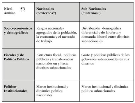 Los factores socioeconómicos y demográficos, político-institucionales, fiscales y de política pública están, sobre todo estos dos últimos, fuertemente relacionados8. No obstante, a los fines analíticos, en lo que sigue de este apartado realizaremos algunas breves consideraciones conceptuales y metodológicas sobre los diferentes tipos de factores prescindiendo de las relaciones entre ellos. Por cuestiones de viabilidad analítica y metodológica, aquí solamente nos focalizaremos en los factores subnacionales (internos) y especialmente los fiscales y político-institucionales (que englobaremos bajo el término factores políticos)9.