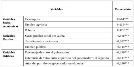 En este apartado examinamos la relación de algunas variables que han sido destacadas por la literatura (tanto «nacional» como «subnacional») con la desigualdad de ingreso, más otras variables no estudiadas hasta ahora pero que, desde nuestra perspectiva, pueden permitir algún avance en el establecimiento de la especificidad del nivel subnacional. Esta exploración está condicionada por los datos disponibles hasta el momento, pero creemos que aún con esta limitación, es posible establecer algunos primeros resultados importantes para la construcción de una agenda de investigación. En primer lugar, examinamos variables socioeconómicas, luego variables fiscales y, finalmente, variables políticas, señalando, en cada caso, si se trata de variables externas o internas. La Tabla 3 muestra los resultados de correlación entre la desigualdad y algunas variables socioeconómicas, políticas y fiscales.
