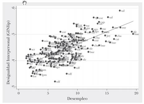 Los resultados reportan también una relación positiva entre crecimiento de la economía nacional y desigualdad (0,26), a pesar de que una parte de la literatura esperaría lo contrario. Sin embargo, no encontramos relación entre variación del producto bruto geográfico provincial (per cápita) y la desigualdad.