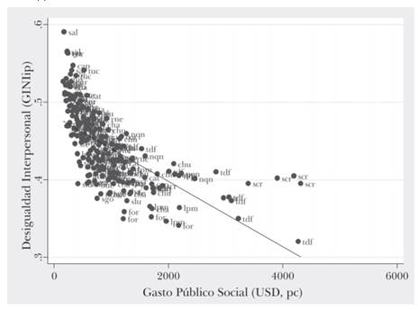 Finalmente, tal como esperan Huber y Stephens (2012), encontramos un vínculo entre el tipo de gasto provincial y Gini. Los resultados indican que el gasto público social per cápita de las provincias se relaciona negativamente con desigualdad. Esta relación es robusta y significativa (ver Tabla 3 y Gráfico 5).