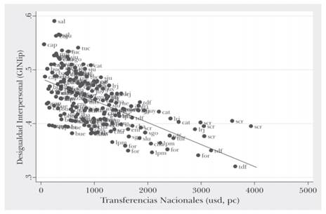 Además, las provincias que reciben montos de transferencias nacionales per cápita más altos tienden a ser más igualitarias. Las dos provincias que reciben más transferencias nacionales per cápita, Santa Cruz y Tierra del Fuego (recibieron 3.934 y 3.640 dólares per cápita en 2011, respectivamente), tienen algunos de los valores de desigualdad más bajos del país (ver Tabla 3 y Gráfico 6)16.