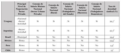 Fuente: Elaboración del Autor basado en análisis por país. Como se explica abajo, Uruguay combina niveles de negociación nacionales/confederal con los Consejos Salariales Sectoriales. La densidad sindical es de OIT, http://www.ilo.org/ilostat/faces/oracle/webcenter/portalapp/pagehierarchy/Page3.jspx?MBI_ID=9 *a) 2013, b)2008, c) 2013 d) 2013 e) 2012 f) 2013.
