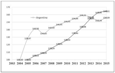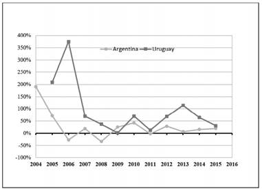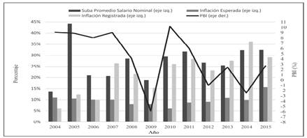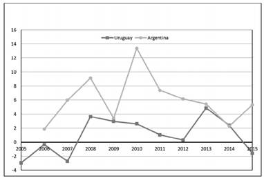 Es apropiado leer la trayectoria del neo-corporativismo en Argentina y Uruguay, especialmente después del pico de crecimiento económico en 2010, y en la subsecuente caída del ciclo, a la luz de esta teoría sobre la interacción entre el Banco Central y las modalidades de negociación salarial. Argentina ejecutó una política monetaria expansiva desde 2003, con bajos niveles de independencia del Banco Central de la autoridad de la política económica. Después de la devaluación de 2002, un tipo de cambio depreciado dio margen de maniobra para tal expansión. Inicialmente, el Banco Central compró dólares disponibles en el mercado de cambios fruto de las exportaciones crecientes y recapturó esos pesos mediante bonos de medio término, con el objetivo de evitar el exceso de liquidez e inflación. A pesar de estos esfuerzos de esterilización, la oferta de dinero creció continuamente (Cetrángolo et. al., 2007). En efecto, el gobierno respondió a la crisis internacional del 2009 con un nuevo impulso de política monetaria expansiva y gasto fiscal. Enfrentándose a presiones crecientes sobre el tipo de cambio, el gobierno estableció control de capitales a fines de 2011. En 2012, la reforma de la carta del Banco Central incluyó los objetivos de empleo y crecimiento, y, más importante, incrementó el techo de transferencias al Tesoro Nacional. También estipuló que las mayores instituciones financieras guardaran una fracción de sus depósitos del sector privado en pesos para préstamos a la producción. Ambas medidas contribuyeron significativamente a la expansión monetaria a partir de entonces (ECLA 2013a p. 3). Mientras el PBI creció continuamente entre 2004 y 2010 (promedio 5,7), el desempeño fue mucho más errático después (en promedio 1,5 entre 2011 y 2015).