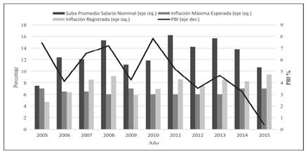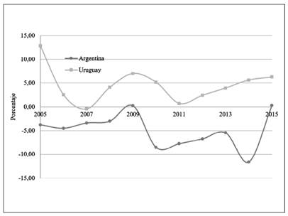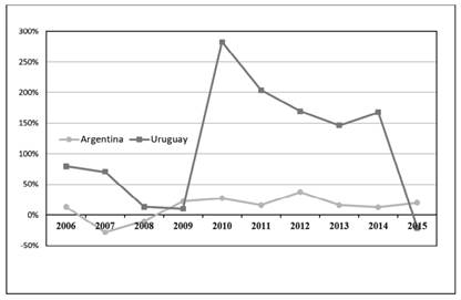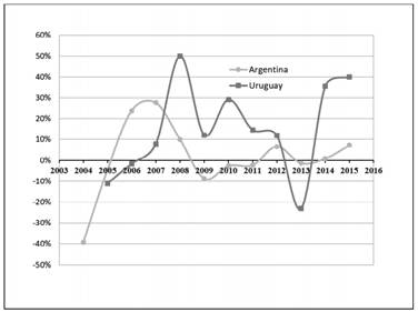 El Gráfico muestra que el gobierno de izquierda uruguayo fue más exitoso que su contraparte argentina en gobernar y coordinar las negociaciones salariales centralizadas. En Argentina la pauta negociada funcionó, en la práctica, como un «piso» de aumento salarial nominal. En promedio, los aumentos de salario nunca estuvieron por debajo del parámetro del gobierno. En buenos años económicos, tales como 2007, 2008 y 2010, los sindicatos (en un contexto de bajo desempleo y baja represión, apoyo gubernamental y crecimiento económico) empujaron los salarios nominales muy por arriba de las pautas de gobierno-algunas veces 9 e incluso 13 puntos porcentuales. El gráfico sugiere que, en los años no tan buenos, como 2009 (impacto de la crisis financiera mundial) y 2014 (crisis cambiaria), la presión del gobierno, combinada con la situación más apretada de las empresas, fue más capaz de contener el aumento del salario nominal. En términos reales, los salarios en Argentina crecieron hasta 2012 y luego se estabilizaron y declinaron levemente en 2013-15 (ver Gráfico 1).