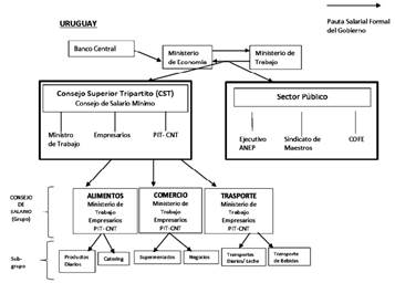 En Uruguay, en marzo de 2005, el gobierno del FA emitió una serie de decretos que ordenaron la restauración de los Consejos de Salario. Se creó el Consejo Superior Tripartito (CTS) a nivel nacional, en el cual los represen- tantes de los empleadores, la confederación nacional del trabajo PIT-CNT y las principales asociaciones de empleadores decidieron sobre los Consejos de Salario (formado por representantes del Estado, Federaciones sindicales y cámaras de negocios) que comenzarían a funcionar en cada sector. Para mediados de 2005, 20 grupos tripartitos que cubrían todo el sector privado estaban negociando los nuevos niveles salariales. El gobierno hizo una presentación formal de «pautas» para el incremento del salario en cada ronda de negociación (aproximadamente cada dos años) en el seno del CST. Este consejo también discutió y recomendó un salario mínimo para ser decretado por el Poder Ejecutivo. Finalmente, el FA también organizó una serie de Consejos de Salario Bipartitos (es decir estado/sindicatos) separados para los empleados públicos en la administración central, educación y empresas estatales5.
