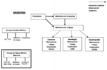 En Argentina, una vez que las negociaciones colectivas comenzaron a ganar impulso después de 2005, el gobierno trató de establecer parámetros de incrementos salariales mediante negociaciones con sus sindicatos aliados más cercanos. En el gobierno de Néstor Kirchner (2003-2007) y en el primero de Cristina Kirchner (2007-2011), el principal aliado en el movimiento obrero fue el sindicato de camioneros liderado por el Secretario General de la CGT, Hugo Moyano. El acuerdo salarial alcanzado con un puñado de empleadores y sindicatos liderado por los camioneros, frecuentemente firmado en una ceremonia en la Casa Rosada, se convirtió en una guía para el resto de la economía. Cuando los camioneros y otros sindicatos de transporte rompieron con Cristina Kirchner a finales de 2011, el gobierno pasó a negociar el parámetro general de salarios con un puñado de sindicatos grandes que dominaban la CGT progobierno (construcción, metalurgia, trabajadores del Estado y comercio). Al mismo tiempo el gobierno de los Kirchner cerró acuerdos para el salario mínimo con la confederación nacional CGT (hegemónica entre los trabajadores privados) y la CTA (mayormente empleados públicos) en el Consejo de Salario Mínimo, todos los años, en el período 2004-2015. Finalmente, en 2008, el nuevo consejo de salario mínimo nacional para maestros (Paritaria Nacional Docente) se convirtió en la base de la alianza con la principal Confederación Nacional de Maestros, CTERA, afiliada a la CTA.