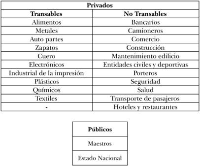Construí una base de datos con la evolución de los salarios nominales en los contratos colectivos de 23 sectores económicos (21 sectores privados más la administración del Estado y maestros) en cada país. Estos son los sectores están entre los más grandes en ambos países en términos de número de trabajadores.