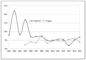 Algunos académicos que trabajan Uruguay sostienen que la fuerza y el radicalismo de los sindicatos del sector público, y su influencia dentro del movimiento obrero, afectan las políticas públicas igualitarias e incluso crean una «puja distributiva» dentro del FA (Luna, 2014, p. 33; Doglio, Senatore and Yaffe, 2004). Sin embargo, los gráficos 3 y 4 sugieren que los sindicatos del sector público no son un problema para el neo-corporativismo en Argentina y Uruguay. En Uruguay, el porcentaje de aumento salarial promedio en el sector privado después de 2007 ha fluctuado entre el 50% y el 100% sobre los de los estatales, excepto por un año. En Argentina la fluctuación es más reducida, pero los aumentos salariales del sector privado son casi todos más altos. Asimismo, el porcentaje de aumento en los sindicatos privados fue siempre más alto que para los maestros en el sector público en ambos casos, pero particularmente en Uruguay excepto por 201512. En resumen, la militancia salarial en el sector público en ambos países parece estar contrarrestada por la incapacidad de los sindicatos estatales para obtener aumentos y por las limitaciones presupuestarias.