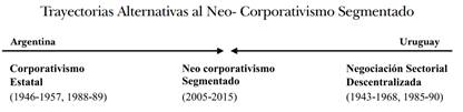 En resumen, Uruguay siguió un camino de negociación sectorial descentralizada hasta los tardíos 60’, cuando la representación sindical unificada nacional se forjó lentamente «desde abajo». Argentina fue un caso de corporativismo estatal clásico, en el cual el monopolio sindical fue forjado «desde arriba» desde los años 40. Sin embargo, la consolidación democrática Argentina después de 1983 lentamente favoreció la autonomía sindical del control más directo del Estado. En Uruguay, el movimiento obrero unificado se combinó con la centralización de las relaciones laborales después de 2005. La Figura 1 representa estas trayectorias alternativas, y señala los períodos generales en los cuales existió algún tipo de negociación salarial agregada. Desde puntos de partida diferentes, en los años 40 (aunque con una base común en la negociación sectorial sancionada por el Estado) ambos países convergieron al neo-corporativismo segmentado a mediados de los años 2000.
