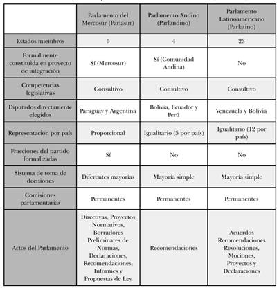 La investigación de Mariano et al. (2017) destaca, de modo comparativo, aspectos relevantes de los parlamentos de América Latina: Parlasur, Parlandino y Parlatino. El análisis se enfoca en los posibles avances en la cooperación regional por medio de las estructuras parlamentarias. Lo que se percibe es que, a pesar del desarrollo institucional, los parlamentos regionales aún tienen aspectos consultivos. La capacidad decisoria sigue a cargo de los representantes ejecutivos, lo que refuerza las tendencias históricas al intergubernamentalismo en la región. En este sentido, la formación de parlamentos regionales representa un esfuerzo para dialogar en el nivel regional sobre las posibilidades de armonización de las normas nacionales para facilitar la integración, pero no avanza en la construcción normativa de un derecho comunitario.