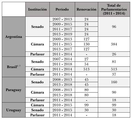 Para este análisis, fueron seleccionados los titulares parlamentarios de los Senados, Cámaras de Diputados y del Parlasur, con el propósito de investigar la existencia de correspondencia entre los niveles doméstico y regional. El recorte temporal culminó en la inclusión, en algunos casos, de más de una legislatura doméstica. El siguiente cuadro sintetiza todo el movimiento en las instituciones.