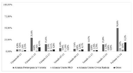 La coalición con mayor incidencia, tanto a nivel doméstico, como en el Parlasur, es el Frente para la Victoria (FPV). Los totales de parlamentarios de esta coalición se presentan muy por encima de los otros grupos. Para el caso del Mercosur estos valores son aún más discrepantes: mientras la frecuencia general se mantuvo entre 1 y 2 políticos, el FPV contó con 13 parlamentarios a nivel regional. A nivel nacional, la alianza Unión PRO y la Unión Cívica Radical siguen en segundo lugar con las mayores cuentas - sumadas - de diputados y senadores (21 parlamentarios, cada uno).