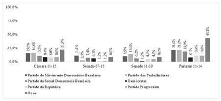 Los datos de Brasil demuestran que los partidos que contabilizaron un mayor número de parlamentarios en las instituciones nacionales - Partido dos Trabalhadores, con 99, y Partido do Movimento Democrático Brasileiro, con 94 - también se manifiestan con un mayor número de parlamentarios en el Parlasur, con 8 cada uno. Estos son seguidos por el Partido da Social Democracia Brasileira, que tiene 7 escaños en el Parlasur y 65 en el Congreso Nacional. Esta configuración confirma que, para el caso brasileño, hay un nivel de correspondencia entre el ámbito doméstico y el regional.