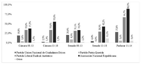En la composición paraguaya, es interesante notar la preponderancia de dos partidos: Partido Liberal Radical Auténtico y Asociación Nacional Republicana. Ambos presentan un alto grado de representación. En particular, en la composición de 2013 a 2018, la Asociación Nacional Republicana ocupó el 55% de los asientos de la Cámara. El Partido Liberal Radical Auténtico, en dos mandatos consecutivos, conquistó el 33,75%. Tanto en el nivel doméstico como en el regional, los números de estos partidos son considerablemente superiores. Este panorama también demuestra cierto grado de correspondencia. Es importante resaltar que el caso paraguayo es sintomático, porque, en este período de análisis, entre 2011 y 2014, es el único país que adoptó la elección directa. Así, es posible inferir que las preferencias domésticas están siendo representadas en el Parlasur.