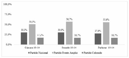 El sistema partidario de Uruguay, a pesar de adoptar el multipartidismo, sigue bases muy próximas al bipartidismo. Esta perspectiva se atribuye al hecho de que, cuando el Partido Frente Amplio fue instituido, los tradicionales Partido Nacional y Partido Colorado se unieron en una alianza para hacer oposición al primero (Lanzaro, 2012). Luego, si se observan individualmente, se encuentran distantes del Partido Frente Amplio, pero teniendo en cuenta la asociación, los tres partidos se equipararon. Esta distribución nacional también se presenta en el ámbito del Parlasur, ya que el Partido Frente Amplio posee 10 representantes y el Partido Nacional y el Partido Colorado suman 8 representantes.