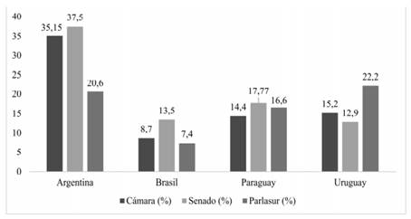 Dicho esto, la participación de mujeres en la composición parlamentaria doméstica y regional fue catalogada como una variable binaria - mujer 1; hombre 0. Se analizó la presencia femenina en la Cámara de Diputados y en el Senado Federal de los cuatro Estados Partes en cuestión y en el Parlasur. El gráfico siguiente resume, en valores porcentuales, la presencia de mujeres en estas instituciones.