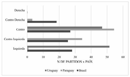 La clasificación ideológica de los partidos que componen los Estados Partes, en un espectro ideológico, fue basada en la clasificación de Coppedge (1997), subdividida en: derecha; centroderecha; centro; centroizquierda; izquierda; otro bloque; personalistas y desconocidos. Se han catalogado los documentos de las organizaciones político-partidarias: carta de principios, manifiestos; estatutos y cartas orgánicas, etc.