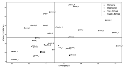 En el siguiente gráfico puede observarse el posicionamiento de cada participante según su nivel de divergencia y cantidad de intervenciones, quienes tienen distintos símbolos según la cantidad de tópicos en los que intervinieron. Cada usuario tiene el sufijo _x en referencia al grupo focal en el que participó, esto es para poder diferenciar a participantes con el mismo nombre de distintos grupos focales. Las rectas que salen de los ejes y y x están en los valores medios (de todos los participantes de los 3 grupos) de intervenciones y divergencia, respectivamente. Mediante este gráfico puede caracterizarse a los participantes por áreas. Así, aquellos por sobre la recta del eje y son los más extrovertidos, mientras que los que están por debajo de ella, intervinieron menos en las discusiones respecto a sus pares y, por lo tanto, los caracterizamos como más introvertidos. Por otro lado, los participantes a la derecha del eje x pueden considerarse los más divergentes, es decir, aquellos que más pasaron en sus intervenciones de una comunidad a otra. Por último, también podríamos caracterizar a los participantes por cuadrante, donde el cuadrante superior derecho contiene a los participantes extrovertidos y divergentes, y el cuadrante inferior izquierdo a los introvertidos y convergentes.