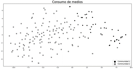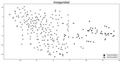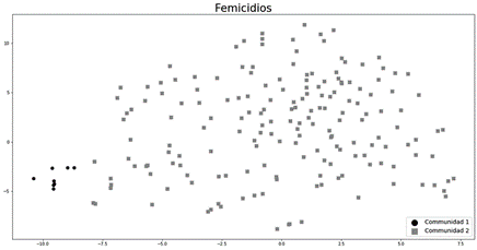 Puede observarse que para los casos de Inseguridad, Corrupción y Consumo de medios, si bien una comunidad es mayoritaria con respecto a la otra, ambas tienen una cantidad significativa de puntos. Sin embargo, en el caso de Femicidios tan sólo 8 puntos corresponden a la Comunidad 2, mientras que las 180 intervenciones restantes pertenecen a la Comunidad Este gran desbalance de magnitudes entre los tamaños de las comunidades es uno de los factores que influyen en un score menos polarizado ya que D1 (ver Ecuación 3) será muy similar a Dtot debido a que se calculó casi con la misma cantidad de embeddings, por lo tanto r tendrá un valor mayor. Esta relación, además, va de la mano con la noción de que para que haya controversia en el debate ambos polos deben tener un tamaño significativo, de lo contrario no sería polarización lo que sucede sino el desacuerdo de un pequeño grupo y una gran mayoría con la misma posición.