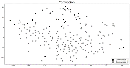 Para tener una mejor interpretación del cálculo de los scores de polarización, decidimos analizar los embeddings de las intervenciones de cada tópico producidos por nuestro modelo. Para esto optamos por visualizarlos a través de una reducción dimensional mediante t-SNE (Maaten & Hinton, 2008). t-SNE (t-distributed stochastic neighbor embedding) es un algoritmo de aprendizaje automático para visualización de datos. En los siguientes gráficos podemos ver los embeddings reducidos a 2 dimensiones mediante tSNE de cada tópico. Cada embedding representa la intervención (desgrabada) de cada participante durante la discusión del tópico y está coloreado según la comunidad de pertenencia detectada.