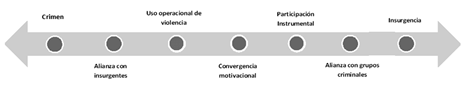 Ahora bien, resulta preciso indicar que este vínculo evoluciona, adoptando la forma de un continuum, con el crimen situado en el extremo izquierdo y la insurrección ubicada en el costado derecho en tanto fenómenos distintos, separados y lejanos conforme al entorno en el que operan, pudiendo ocurrir entre ambos una amplia gama de interacciones como se observa en la Figura 1. Desde este ángulo, cabe destacar que en la mitad del recorrido se encuentra un punto denominado convergencia motivacional, donde un grupo insurgente adopta estrategias criminales y políticas, de manera simultánea e intercambiable, a la vez que son dos extremos de un espectro en el marco de un conflicto armado (Makarenko, 2008).