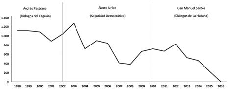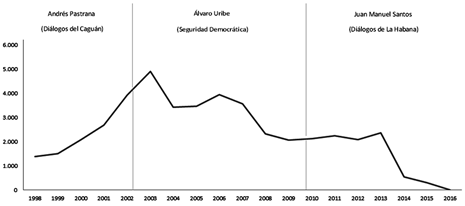 Finalmente, los diálogos con las FARC, que habían ocupado la mayor parte de su gestión, se interrumpieron en febrero de 2002 luego de que éstas secuestraran un avión. Acto seguido, Pastrana ordenó a las Fuerzas Militares recuperar el control de la zona de distensión y capturar a los principales líderes de la guerrilla. Mientras la primera condición se cumplió, la segunda no. Incluso, tras los atentados del 11-S, las FARC fueron rotuladas como una organización terrorista, amparándose en los criterios utilizados por el gobierno estadounidense. Desde entonces, se dio inicio a un renovado combate que se convirtió en una “guerra contra las drogas”, generándose una escalada de violencia por ambas partes en conflicto con una pesada carga sobre la población civil (ver Gráfico 1). Tras las fallidas conversaciones de Pastrana, el fantasma de un eventual Estado fallido impulsó la necesidad de recuperar la capacidad, legitimidad y soberanía del Estado. La construcción de aquella imagen caótica produjo un cambio de enfoque, por cuanto su sucesor Álvaro Uribe (2002-2010) llegó a Casa de Nariño adoptando una línea dura de contrainsurgencia para diezmar la capacidad operativa de la guerrilla, en parte gracias a los recursos económicos transferidos mediante el Plan Colombia12.