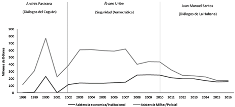 Las Fuerzas Armadas colombianas, por el contrario, estaban mal entrenadas, mal equipadas y desmoralizadas. Pastrana entendía que la guerrilla podía fortalecerse durante el proceso de paz, por lo que no podía permitirse el lujo de no modernizar su aparato militar y ceder más terreno. Durante las negociaciones, Pastrana cortejó mediante intensos esfuerzos diplomáticos a su homólogo estadounidense Bill Clinton para involucrarse más activamente en el conflicto, solicitando una “intervención por invitación” que implicaba aceptar la agenda antinarcóticos de Estados Unidos (basada en la interdicción y erradicación forzada) a cambio del apoyo militar, técnico y socioeconómico de Washington (Tickner, 2014). El resultado fue el Plan Colombia, un paquete de ayuda diseñado conjuntamente, cuyo objetivo era combatir la insurgencia, aumentar el control territorial, extender el Estado de derecho y perseguir el desarrollo socioeconómico colombiano (FelbabBrown, Trinkunas y Hamid, 2018:88-89).
