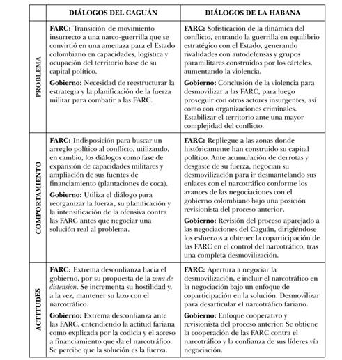 Como se puede observar en la tabla 1, el problema que las FARC y el Gobierno colombiano identificaron como lo central para configurar sus respectivas estrategias con miras a los diálogos del Caguán resultaron, más bien, antagónicos en cuanto al foco del mismo. En cambio, con los diálogos de La Habana, existe un importante punto de convergencia: la dinámica de la violencia. Ante esto, ambos actores coincidieron en la necesidad de solucionar el conflicto a través de la negociación.