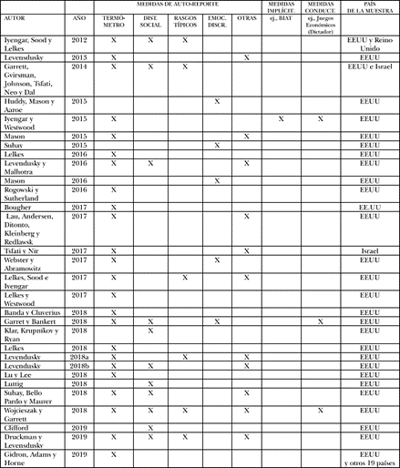 De acuerdo a nuestra revisión, el tipo de medida más utilizado ha sido el auto-reporte (self report). En una medida de auto-reporte se les pide a los participantes que respondan distintas preguntas acerca de sus propios pensamientos, emociones y/o actitudes con respecto a, por ejemplo, distintos partidos políticos2. Una de las grandes ventajas que presentan estas medidas es que, para algunos países (ej., EEUU), vienen siendo incluidas en encuestas de alcance nacional desde hace décadas, de tal manera que pueden ser consideradas en análisis de series de tiempo. Dentro de las medidas de auto-reporte pueden distinguirse la medida de termómetro, la medida de distancia social, la medida de evaluación de rasgos típicos y la medida de evaluación de emociones discretas, como las cuatro más utilizadas (ver Tabla 1).