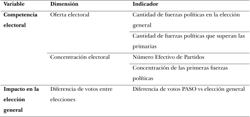 A fin de contrastar las hipótesis propuestas, se crean dos variables: 1. Competencia electoral; 2) Impacto en la elección general.