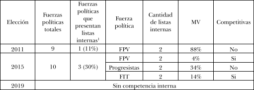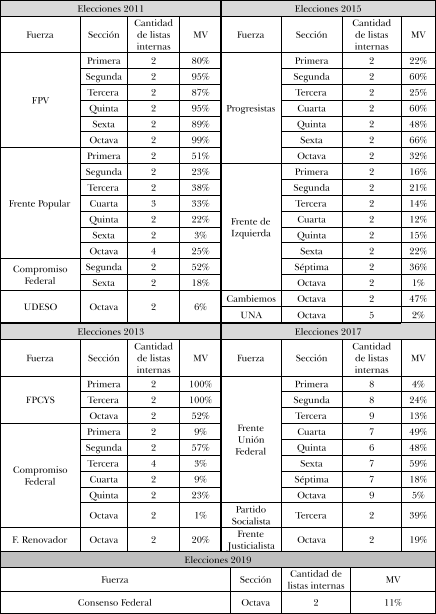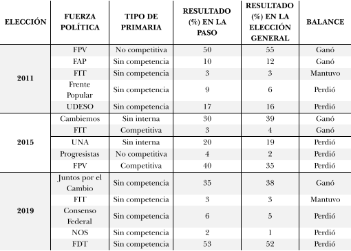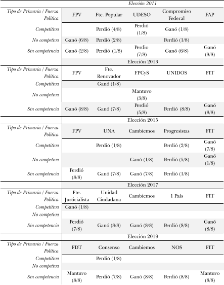Cuando observamos la cantidad de partidos que decidieron presentar más de una lista en las primarias de forma competitiva, no competitiva o bien no hacerlo (sin competencia), no arroja regularidad. Fuerzas políticas que tuvieron primarias competitivas, en algunos casos ganaron votos, como el Frente Renovador en 2013, mientras que otros perdieron, como Unidos por una Nueva Alternativa en 2015. Lo mismo puede destacarse en los casos sin competencia, como en los comicios de 2019, donde la mayoría de los frentes presentaron solo una lista interna en todas las secciones y sin embargo tuvieron resultados disímiles; dos de ellos mantuvieron los votos entre las PASO y la General (el FDT y el FIT); Cambiemos ganó votos y Consenso Federal (el cual tuvo primarias competitivas en una sección) perdió votos.
