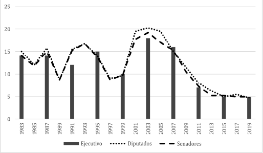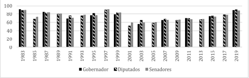 A pesar de tener objetivos diferentes, la dinámica es similar al indicador de la oferta, es decir, que, en primer lugar, la competencia por la Cámara de Diputados y la Cámara de Senadores es semejante durante todo el período estudiado, al igual que en la lucha por la Gobernación.