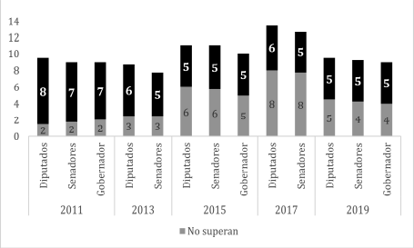 A continuación, nos preguntamos qué impacto tuvieron las nuevas reglas institucionales en los cambios en la oferta. Para ello, comparamos la cantidad de fuerzas en competencia en la primaria con aquellas que logran superar el umbral legal del 1,5% de los votos positivos que permiten acceder a la elección general.