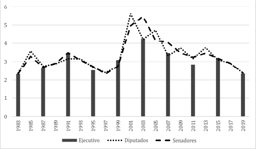 El indicador Número Efectivo de Partidos (NEP), creado por Laakso y Taagepera (1979), mide el grado de fragmentación partidaria. De esta forma, el NEP electoral logra evaluar cuántas fuerzas concentran la competencia por el acceso a los cargos. En este caso se utiliza el indicador sobre la competencia electoral y no sobre las bancas obtenidas por los partidos políticos. Para el caso del Poder Legislativo, se hace un promedio en cada elección entre las secciones que escogen senadores y aquellas que eligen diputados.